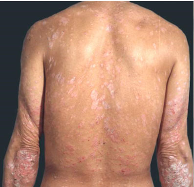 寻常型银屑病起病初为炎性红色丘疹,大概绿豆大小,以后逐渐扩大或融合成为棕红色斑块,周围有炎性红晕,基底浸润明显,表面覆盖多层干燥的灰白色或银白色鳞屑。大部分患者为冬重夏轻,少数患者夏重冬轻。