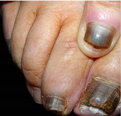 它是由一大类称做病原真菌的微生物感染引起的。甲癣病变始于甲远端、侧缘或甲褶部,表现为甲颜色和形态异常。患病甲板失去光泽,日久甲板变脆而破损脱落。多呈灰白色,且失去光泽;甲板增厚显著,表面高低不平。其质松碎,甲下常有角蛋白及碎屑沉积。
