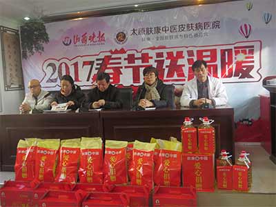 新春佳节即将来临,困难群众和孤寡老人的衣食冷暖牵动着肤康志愿者的心。1月19日下午,山西晚报、太原肤康中医皮肤病医院联合举办的2017春节送温暖公益行动在太原铁路迎春社区温暖举行,山西晚报总编尹长虹、太原肤康皮肤病医院杨院长等出席了启动仪式,并为困难群众送上新春的祝福和慰问品,送去志愿者的关怀与温暖。