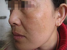 家住山西阳泉的小程是某公司的前台服务,平时都是打扮的美美的上班,可是较近一年不知道是什么原因脸颊上长了好大一块黄褐斑,同事都开玩笑的说小程变成了“黄脸婆”。
