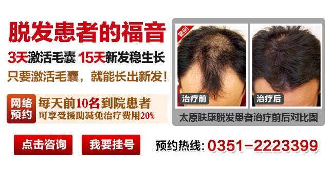 太原肤康皮肤病医院始终坚信,只要存在毛囊,就能生发成功!“汉方小分子毛囊激活疗法”根据中医“整体调理,从根论治”的原则,清脂排毒,激活毛囊,对症分型、中西医结合、多管齐下治脱发。特别对脂溢性脱发、神经性脱发(斑秃)、病理性脱发、内分泌性脱发获得显着效果。