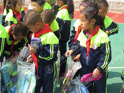 (志愿者给孩子发书包)