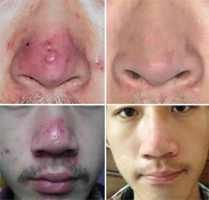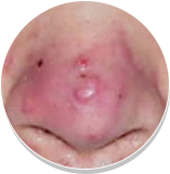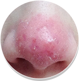 鼻尖及其两侧面颊出现丘疹、脓疱,毛细血管扩张更明显。
