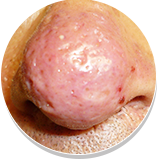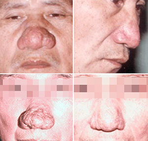 鼻尖肥大形如鼻赘,表面高低不平,皮脂腺口扩大,毛细血管更显著。