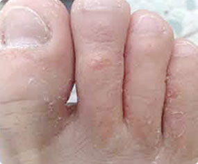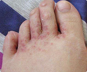 趾间糜烂型好发于第3、4或4、5趾间,表现为少量鳞屑,自觉奇痒。因搔抓易引起继发细菌感染,局部形成糜烂,湿润有渗液。