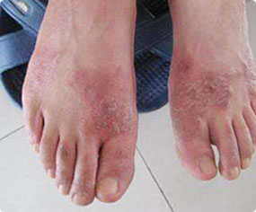 鳞屑角化型表现为足跖、足跟及足侧缘有局限性不整形嗜红色鳞屑性斑片,表面角化明显,粗糙干燥,境界清晰或不清晰。